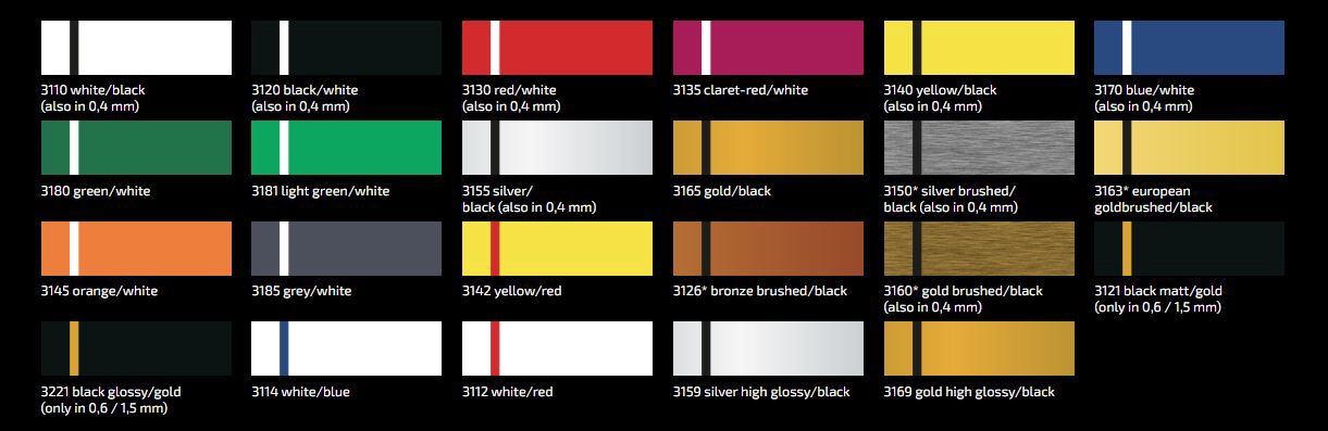 Placas de Trafolite para gravação a Laser, aplicável em: identificadores pessoais, avisadores, identificadores de plantas, museus, galerias, quadros elétricos, etiquetas de propriedade, placas comemorativas, trofeus, sinalética, entre outros.
