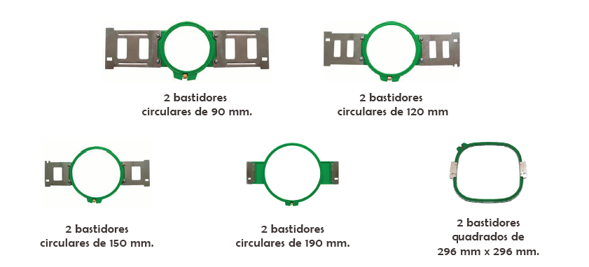 Conjunto de 10 bastidores: 2 circulares 9cm, 2 circulares 12cm, 2 circulares 15cm, 2 circular 19cm e 2 quadrados 29.6x29.6cm.